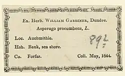 In the United Kingdom, Gardiner's specimens are cared for at the Natural History Museum in London,[4] the Kew Herbarium,[4] the Department of Biological Sciences,[4] Dundee University,[4] Hull University,[4] the Bromfield Herbarium,[4] and the Hancock Museum in Newcastle upon Tyne.[4] Elsewhere in the world, The University and Jepson Herbaria at the University of California, Berkeley,[4][7] the Muséum national d'Histoire naturelle[8] and the National Herbarium of Victoria, Royal Botanic Gardens Victoria also hold his specimens.[9] Under the title Twenty lessons on British Mosses; first steps to a knowledge of that beautiful tribe of plants ... illustrated with specimens Gardiner authored books which include mounted specimens for educational purposes. They resemble exsiccata booklets.[10]