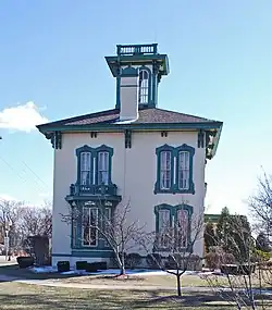 The Upton House is a two-story Italianate-style house constructed of brick with a hipped roof and tall cupola.[2] The brick construction indicates the relative affluence of the builder. The exterior is painted and heavy brackets support the eaves. Windows are tall, double-hung, four-over-four lights; the ones on the front facade feature ornate stone hoods while windows on the other sides have brick hoods. A 1+12-story, gable-roofed addition is located on one side, and a flat-roofed, single-story addition is on another. The cupola, porches, chimneys, and bay window balustrade were reconstructed during the 1981-82 renovation.[2]