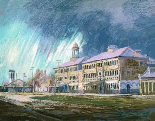 His impression of the multicultural Vieux Carré in a crescent of the Mississippi River provided lifelong artistic inspiration. Unlike the wide-open spaces of his youth, the Quarter was crowded with European-style residences alongside docks, open air markets, dry goods stores, and hardware stores, all located in the shadow of St. Louis Cathedral on the city's main square. His impressionistic views of the Vieux Carré were paramount in focusing attention on the historical structures, many of which were being recklessly destroyed. In 1895, he was in the forefront of the movement against the demolition of The Cabildo, the seat of government during the Spanish Colonial period, rebuilt after the 1794 fire and one of the few surviving structures of the colonial era. This battle for historic preservation in the French Quarter ultimately led to the establishment of the Vieux Carré Commission.