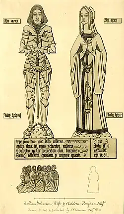 He died in either 1472 or 1477 and was buried in Rougham church.[1] "The inscription on his tomb, printed by Weever, has no date. Rubbings of the monumental brasses to him and his second wife are found in the vestry of Rougham church.[9] After his death his estate passed to his son William.[10]