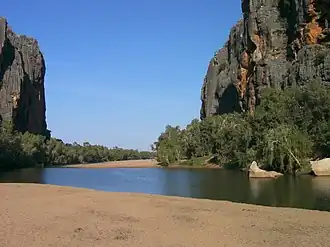 The river flows freely through the gorge during the wet season but during the dry season (between May and September) it becomes a series of pools surrounded by trees and shrubs. Some of the vegetation found along the river banks include paperbarks, cadjebuts, native fig trees and leichhardt trees.[5]