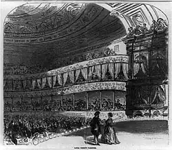 A rare etching of the interior of the theatre at this time depicts a production by Laura Keene in her theatre; From the point of view of the stage, it depicts what is probably the production of a classical text, with two figures in historical costumes standing downstage close to the footlights.[13] This etching, from the actors' point of view, gives a rare glimpse into theatrical production on the American stage in the pre-Civil War era.