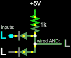 The wired AND connection is a form of AND gate. When using open collector or similar outputs (which can be identified by the ⎐ symbol in schematics), wired AND only requires a pull up resistor on the shared output wire. In this example, 5V is considered HIGH (true), and 0V is LOW (false). This gate can be easily extended with more inputs.
