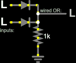The wired OR connection electrically performs the Boolean logic operation of an OR gate using open emitter or similar inputs (which can be identified by the ⎏ symbol in schematics) connected to a shared output with a pull-down resistor. This gate can also be easily extended with more inputs.