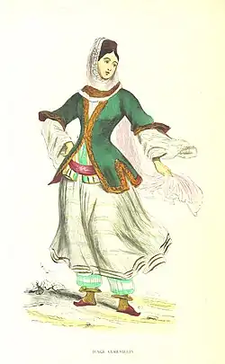 ![]() An Armenian woman from New Julfa in national costume. From The Costumes of Armenian Women by Gregory Lima (Tehran, 1974) | |