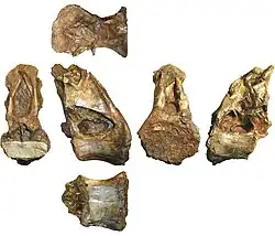 The partial posterior back vertebra, cataloged as BMNH R2095, was briefly described by English naturalist and paleontologist Richard Lydekker in 1893. He thought that it might belong to Cetiosaurus brevis, better known today as Pelorosaurus conybearei.[2] The bone attracted little attention for decades, sitting on a shelf at the British Natural History Museum in London for 113 years. Mike Taylor, a sauropod vertebra specialist, stumbled upon it and became interested in the unusual specimen, entering into a description of it with Darren Naish.[5]
