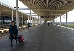 The station has 4 platforms (2 island platforms) and 6 tracks, of which 2 are through tracks. Platform 1 and 2 are for southbound trains and Platform 3 and 4 are for northbound trains. The station building is located to the east of the platforms.