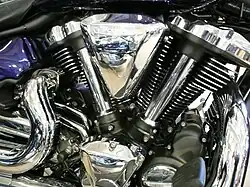 The 1,854 cc (113.1 cubic inches) four-stroke, air-cooled, 48 degree V-twin engine was purpose-built to deliver maximum torque at 2,500 rpm in the 55 to 75 mph (90 to 120 km/h) range used for motorcycle cruising. Each cylinder has four pushrod-activated valves and twin spark plugs.[4] To reduce friction, the forged pistons have an Alumite coating and travel in ceramic-composite-coated cylinder bores.[3]