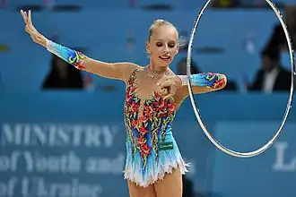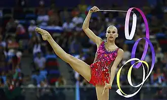 She holds the record as the youngest rhythmic gymnast to win the World Championships in the All-around at 15 years of age.[7] She broke another record at the 2014 World Championships becoming the youngest to win back-to-back All-around World titles at 16.[8] Kudryavtseva was one of the finalist for the 2015 SportAccord Awards in category of the Sportswoman of the Year 2014.[9] At the 2015 World Championships, Kudryavtseva for the first time became the youngest to win three World All-around titles at 17 years of age, she won with a total of 75.632 surpassing her previous score at Worlds.[10] She is a former record holder under the (2013–2016) 20-point judging system in the all-around with a total of 76.450 points. Her record was broken twice by teammate Margarita Mamun.