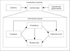 The state has higher administrative capacity the more decision-making power is concentrated in central state institutions insulated from political, partisan, and popular influence. Bensel roughly ranks these institutions' adherence to statist principles in descending order as follows: state bureaucracy, national courts, presidency, congress.