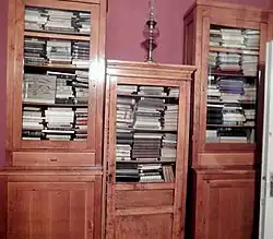 Charents's personal library forms a part of the Memorial House. According to the poet's daughter Arpenik, his library consisted of 6000 books in the 1930s. After his arrest during Joseph Stalin's Great Purge, a large number of books were destroyed. Now there are 1452 books in the library, including many valuable works in different languages on different subjects, such as arts and religion.[3]