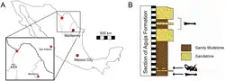 Specimens of Yehuecauhceratops were recovered during excavations from 2007 to 2011 in a locality near the town of La Salada, in Ocampo, Coahuila, Mexico,[1] about 23.3 kilometres (14.5 mi) south of Big Bend National Park in Texas. The rocks exposed in this locality belong to the Campanian Aguja Formation, although its precise location within the temporal range of the formation is difficult to establish.[2] Specimens attributed to Yehuecauhceratops are stored in the palaeontological collection of the Museo del Desierto.[1]