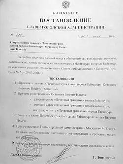 Yevgeny Ilyich Ostashev (Russian: Евгений Ильич Осташев; 22 March 1924 – 24 October 1960), was the test pilot of rocket and space technology, participant in the launch of the first artificial Earth satellite, head of the 1st control polygon NIIP-5 (Baikonur), Lenin Prize winner, Candidate of Technical Sciences, engineer-podpolkovnik.