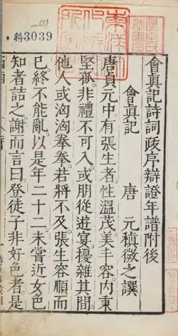 A page from a printed copy of Yingying's Biography by Yuan Zhen
