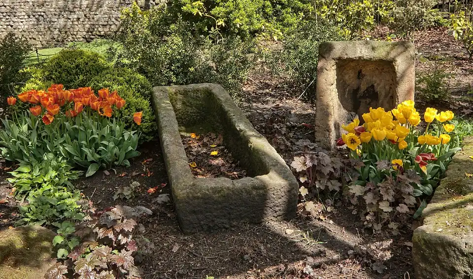 The Multangular Tower is the western corner tower of the Roman fortress, and consists of both Roman and medieval architecture. The tower has 10 sides, from which it derives its modern name "multangular", and is 19 feet (5.8 m) high.[39] It was built in its late Roman form during the early 4th century,[40] when it was constructed with three floors to house a catapult.[39] Five Roman stone coffins are in the Multangular Tower, which were brought from graveyards in other areas of York.