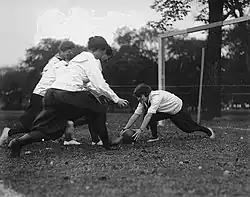 Youth athletics also affected the lives of boys as it could be used to define masculinity.[17] Sports were a way to promote bravery, and were tied to masculinity through Muscular Christianity.[17] Sports were even thought to reduce degeneracy as boys were thought to be becoming less brave than their forefathers by some.[17] Betty DeBerg believes that gender divisions increased as some feared that industrialization and city life were changing gender roles.[17] Sports were thought to be a way to increase masculinity in boys and to perpetrate social divisions. Furthermore, the masculine aspect of sports perpetrated through the 20th century has continued an idea of homophobia.[18] Eric Anderson states, "in a time of greatly decreasing cultural and institutional homophobia, institutions of sport have remained steadfast in their production of a homophobic and conservative gender ideology."[18] In 1997, a high school football player wrote that he faced "victimization and personal distress over the profusion of homophobia within his sport..."[19] This homophobic environment lead to depression for the victim.[19] The heightened idea of masculinity has allowed homophobia to also permeate sports. Youth sports within the 20th century enforced masculinity on boys, as well as created an environment filled with homophobia.
