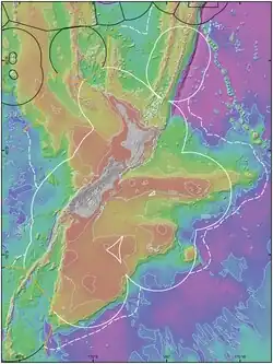 The breakup of Gondwana formed Northern Zealandia.[29] Zealandia underwent extension resulting from east to northeast-directed rollback of west to southwest-dipping subduction of the Pacific Plate.[30] which terminated between 95 million[30] to 85 million years ago.[31] After 85 million years ago Zealandia separated from Australia through seafloor spreading of the Coral and Tasman seas until this ceased 52 million years ago.[31] Shortening on an active convergent northern margin of Zealandia occurred mainly between 45 and 35 million years ago.[31] This was followed by the opening of the backarc basins of the southwest Pacific and the migration of the Tonga and Kermadec Trenchs to the east.[31] Shear extrusion followed between 23.3 million to 5 million years ago with the New Zealand Alpine Fault rupture and a southwestward extension of the Campbell Plateau relative to the Challenger Plateau.[30] Southeast Indian Ocean Ridge expansion movement completely separated Zealandia from the Antarctic at about 10 million years ago.[30] In the last 5 million years Zealandia has been generally subsiding owing to the Pacific Plate subducting westward and retreating eastward.[30]