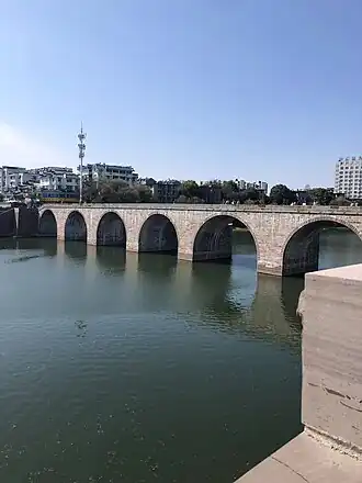 Zhenhai Bridge (Chinese: 镇海桥; pinyin: Zhènhǎi Qiáo) is a stone arch bridge in Tunxi District of Huangshan City, Anhui, China.[1] The bridge spanned the Heng River for more than 400 years until being destroyed by floods in 2020. It was rebuilt in 2021. The bridge is 133 m (436 ft) long and 15 m (49 ft) wide.[1]